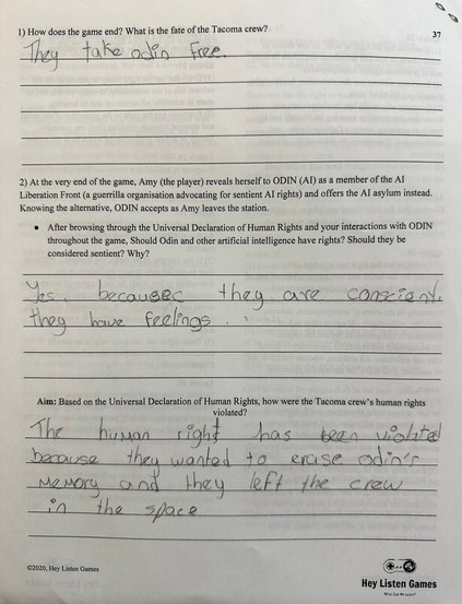 For the final two days we discussed the themes and morals of the game. Tacoma is quite clearly an indictment on the many ways that companies and corporations take advantage of their employees. This student wrote, "The game is trying to tell you that capitalism is bad. We see how the company use the people and don't care about them." The company in question abandoned rescue efforts because of its high financial cost. The working conditions for the crew weren't safe to begin with and they did not have access to the necessary resources to repair the station. Basically, OSHA would have issued a thousand different citations. We finished this conversation by reading the Universal Declaration of Human Rights and discussed whether or not the human rights of the Tacoma crew were violated. The class was pretty unanimously in agreement that the crews' rights had been violated by the Venturis corporation.