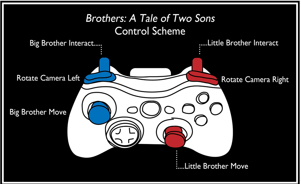 As I stated before, the game usually requires one person to control both brothers at the same time. For this lesson, however, two students will hold the controller together. This will allow each student to control one of the brothers. This image may make it easier to visualize. Each player only has three actions. The joystick will move their respective character. The trigger buttons will cause the brothers to interact with the environment, or person, and the bumper buttons rotate the camera. The simple control scheme will allow both players to be able to play with only one hand on the controller at a time. The students will need to communicate in order to progress through the game. This will be especially fun for my students since I teach at a school dedicated to English Language Learners. They will be forced to work cooperatively in a language that they are still in the process of learning.