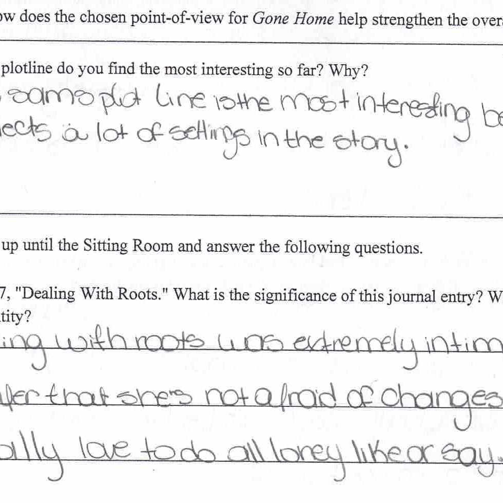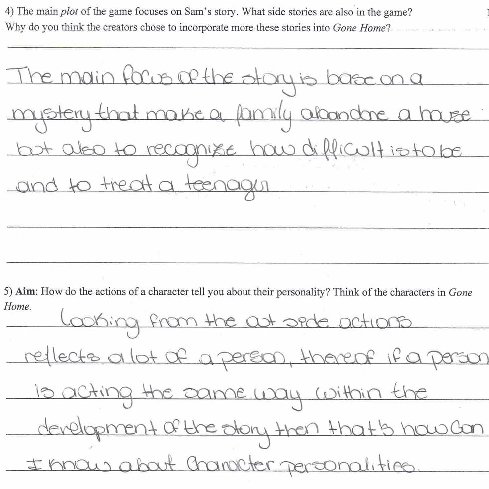 This student in particular has shown genuine interest in the story of the game. This might be because this is her first experience with a video game other than playing Mario. After finishing playing through the first floor of the house, this student had a pretty decent understanding of the characters presented in the game. She knows that Sam is having a difficult time and is shy. She discovered that Terrence, the father, is a writer, but is currently struggling to get a book published. She didn't learn too much about the mom, but noticed she works in agriculture. And she determined that Lonnie is "kind of a punk girl," which interests Sam because she never really resonated with people who fit the stereotype of being girly. From the four available journal entries in this section of the game, this student really got a greater understanding of why Sam is having a difficult time making friends. She was really only ever friendly with a neighbor and always struggled to be friends with other girls. In question 4, the student remarks how the main plot of this game focuses on "how difficult it is to be and to treat a teenager."Being a teenager is not easy, especially if you have a difficult time making friends.